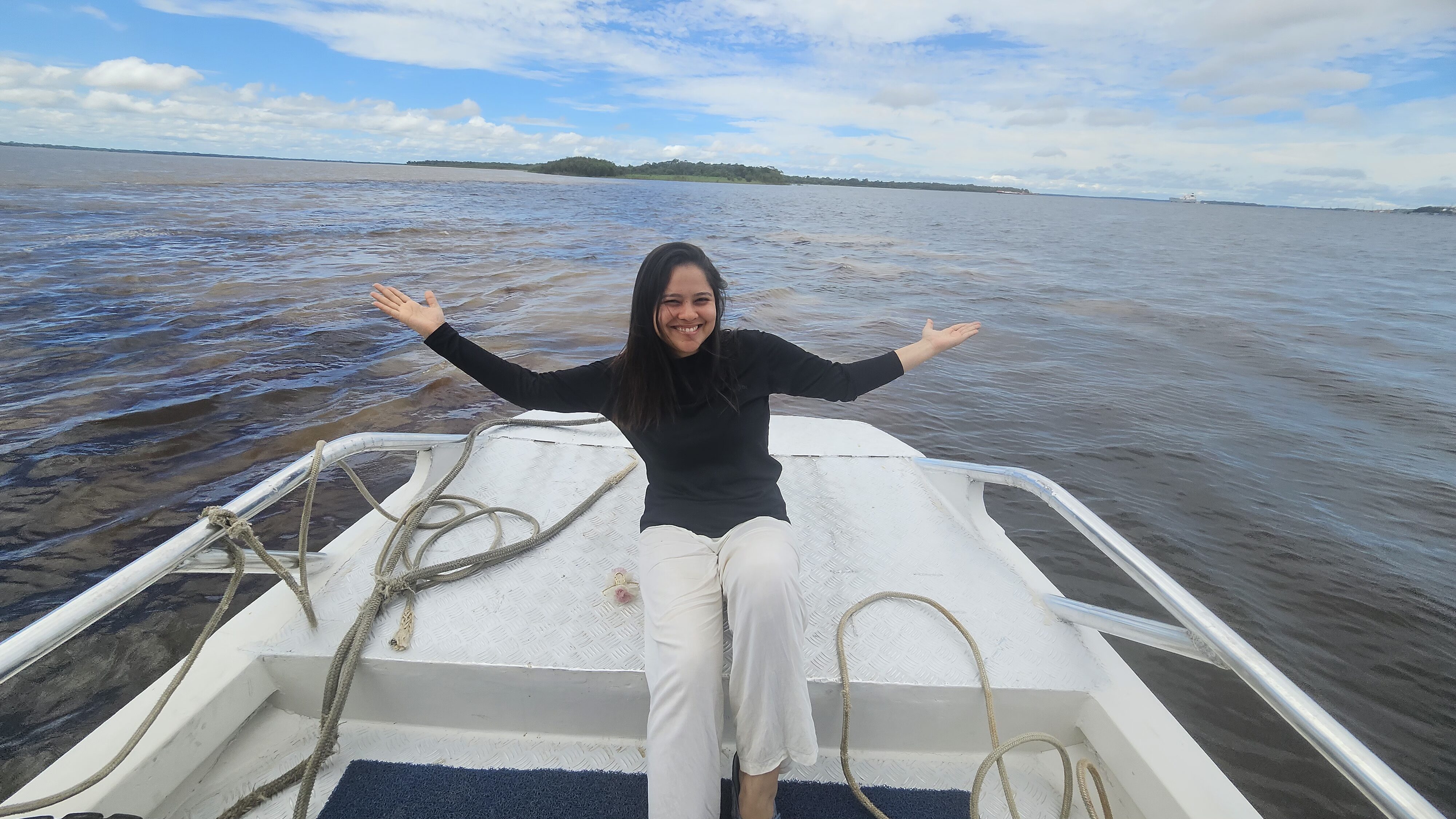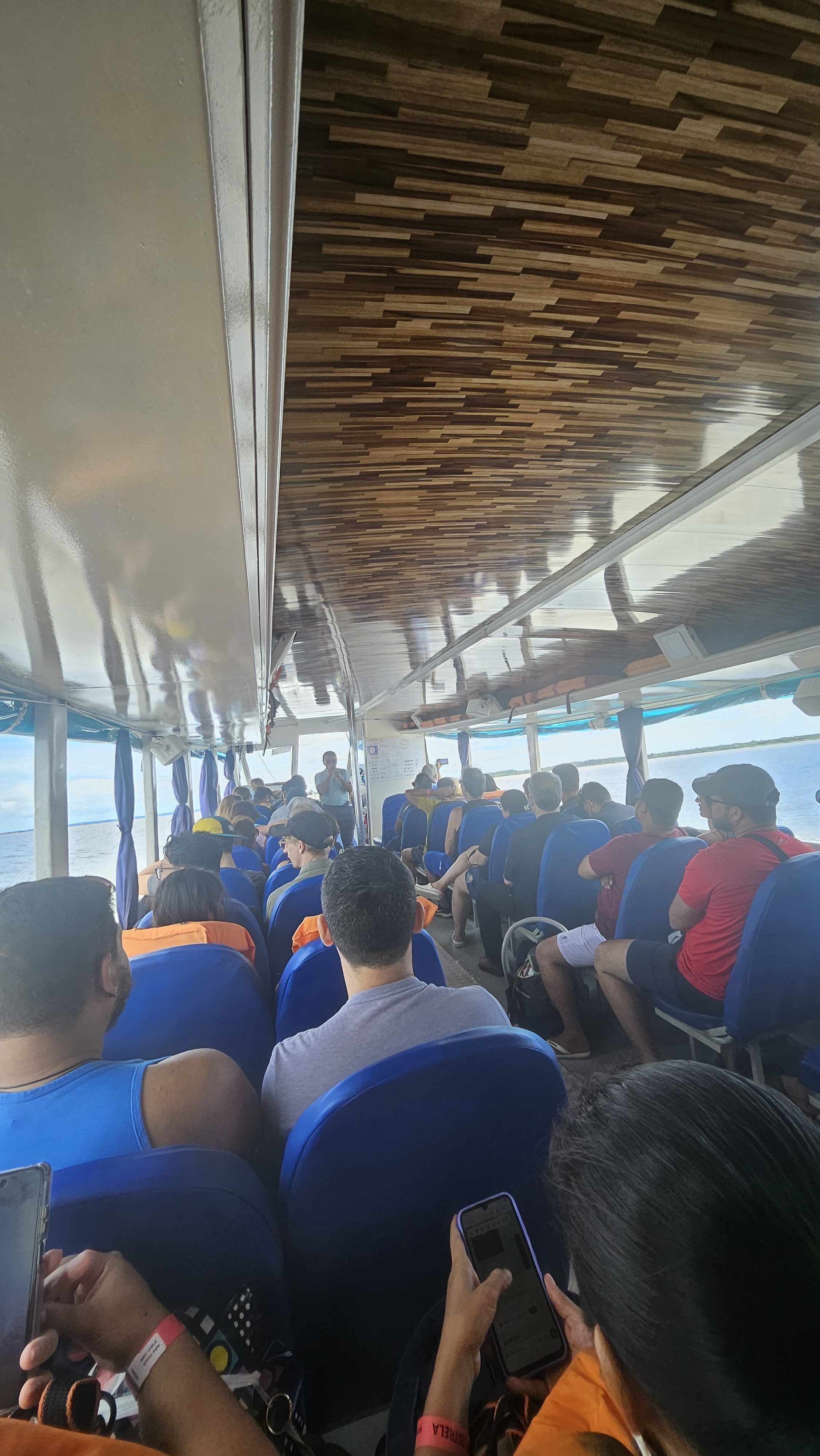 O primeiro destino é um dos momentos mais aguardados: a interação com os famosos botos-cor-de-rosa. No local, os turistas podem observar, alimentar e até nadar com os animais, em uma experiência marcante e segura.